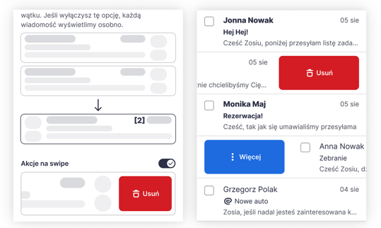 Akcje na „swipe” włączysz i wyłączysz w zakładce Lista wiadomości, w Opcjach (w przeglądarce na telefonie).