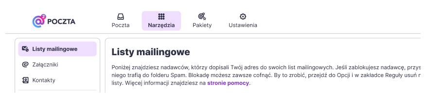Zbudowaliśmy Narzędzia. Znajdziesz je w głównej nawigacji. Skorzystasz w nich z List Mailingowych, Załączników i Kontaktów. Wkrótce rozbudujemy je o kolejne możliwości.